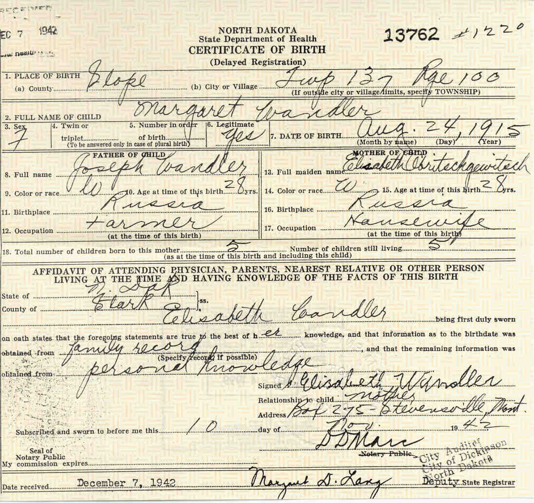 • She has conflicting birth information of 24 August 1915 in Belfield, Stark, North Dakota. 37